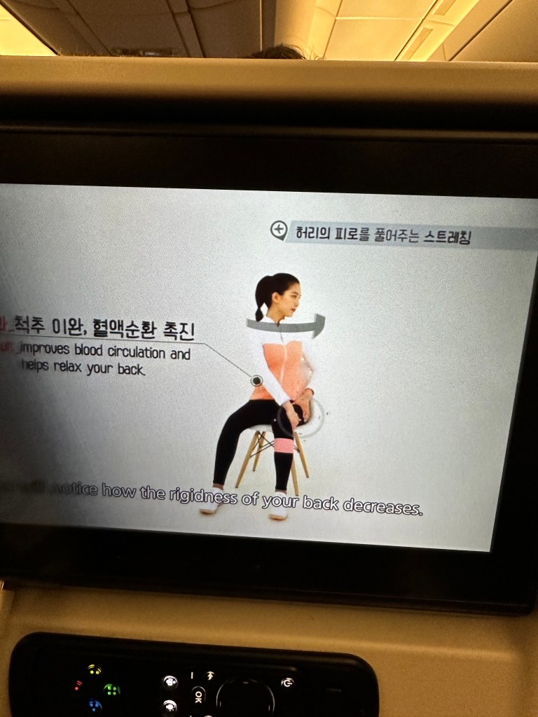 A big laugh for us was the exercise activity on the plane boefore landing! The entire plane did seat stretching together.