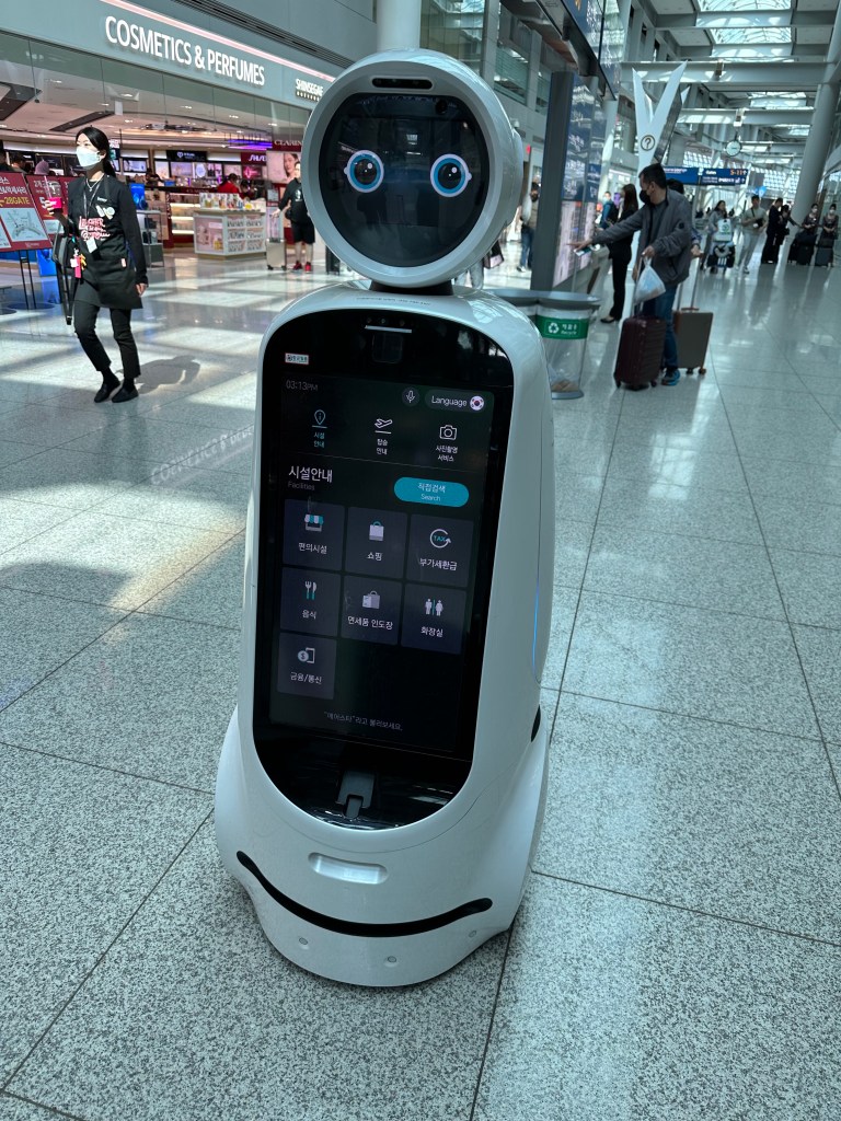As we headed to our next destination, we made a friend with Airport Robot. She walked us to our restaurant destination and guided us through “hazardous” obstacles (people walking too close).