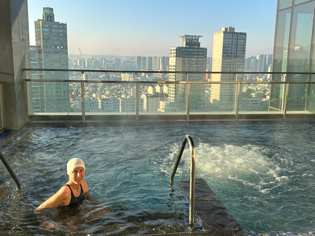 Our hotel was phenomenal, but time was limited so we took advantage one of the most beautiful hotel pool and hot tubs for just a few minutes at 6am! The bathing caps were provided!