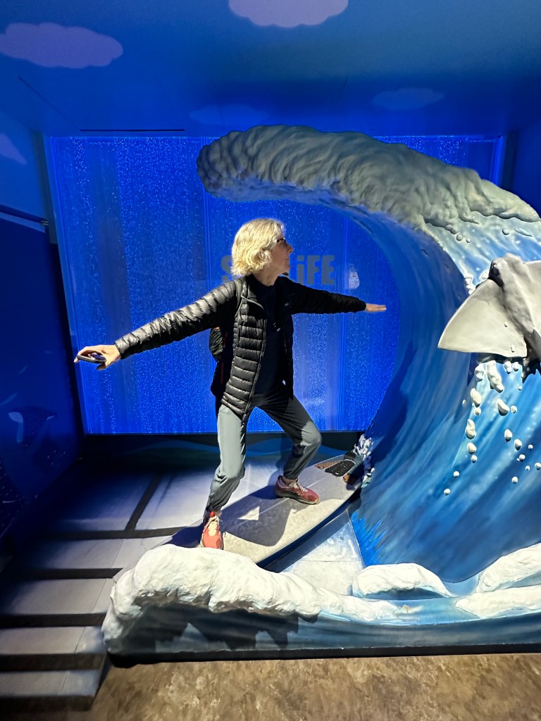 The bullet train was up next, and it did not meet our expectations for speed, but we have now at least been on one. The downside of the three hour trip was halfway through, we realized the fish market we were tasked with visiting was closed every third Tuesday! Uggh. Our only alternative was a very touristy aquarium. But, we made the most of it and bonded with a three finned giant sea turtle!