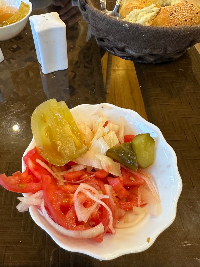 - Afsona for lunch for some traditional Uzbek cuisine. No, we did not try the horse meat. Once again, Shannon ate some tomatoes, bread and pickled vegetables as everything has meat.