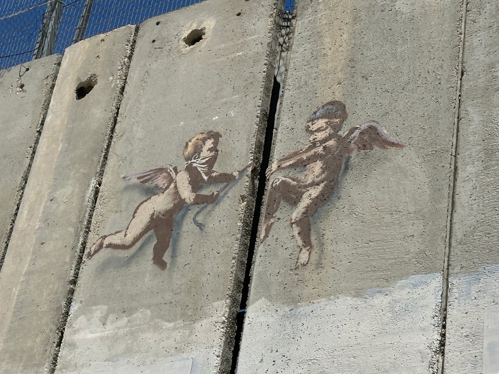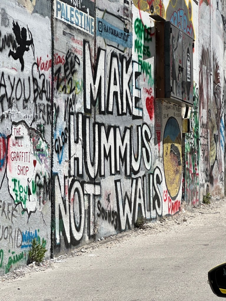 The cab drivers in Bethlehem had a lot to share about the history and the Wall, which has 2 Banksy paintings. Our favorite wall graffiti was Make Hummus Not War.