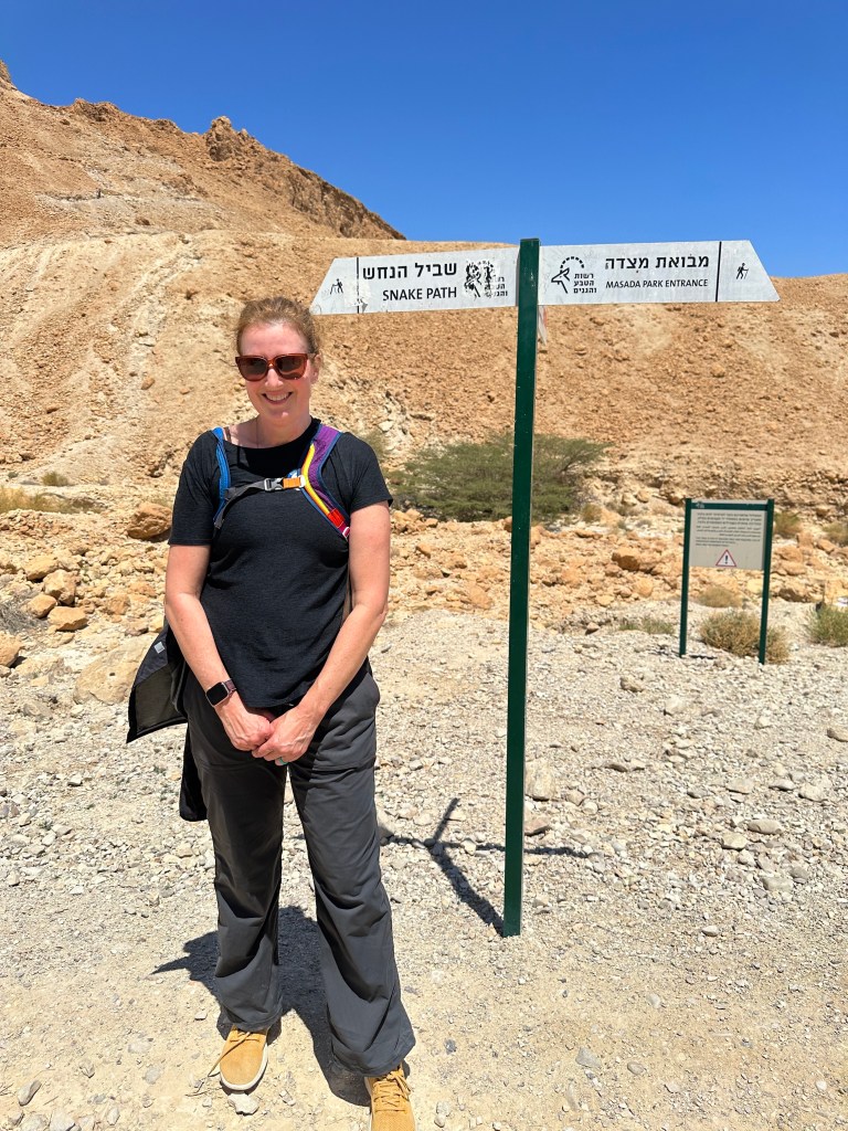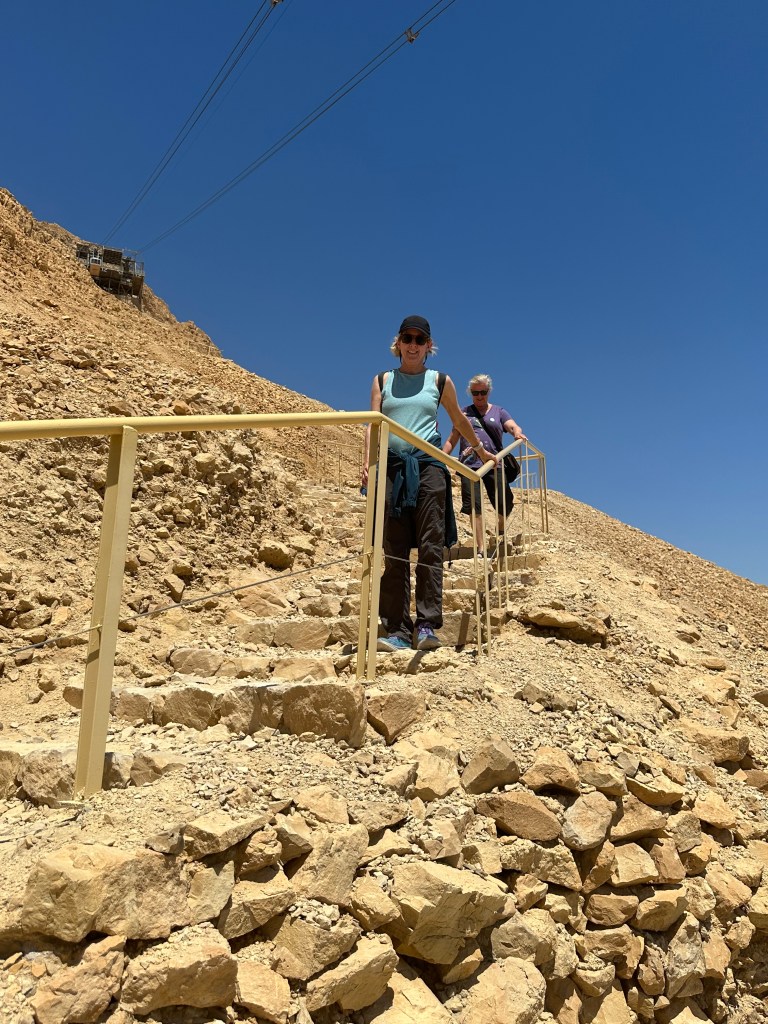 The final day in Israel, we were allowed to book a group tour. Usually, we are not allowed to travel this way as it undermines the spirit of the trip as you are not interacting with locals. We joined a group to Masada and then to float in the Dead Sea. We were forced to stop at the typical tourist traps including the camel ride, the gift shop and the cafeteria style restaurant. It may have been the first time for many of us to experience giant greyhound buses, a tour guide with a flag and stickers on each group member. Eeeks! We broke group tour protocol to ensure that we would get the points for our scavenge, which required us to walk down the mountain, not take the cable car. We escaped and walked 1.3 miles down. It caused quite a stir. Next stop was the Dead Sea which was like floating in an anti-gravity chamber. You are supposed to take the mud from the sea and rub it on your body as an exfoliant. Donna did a mini facial. Shannon was wiser than to do that.